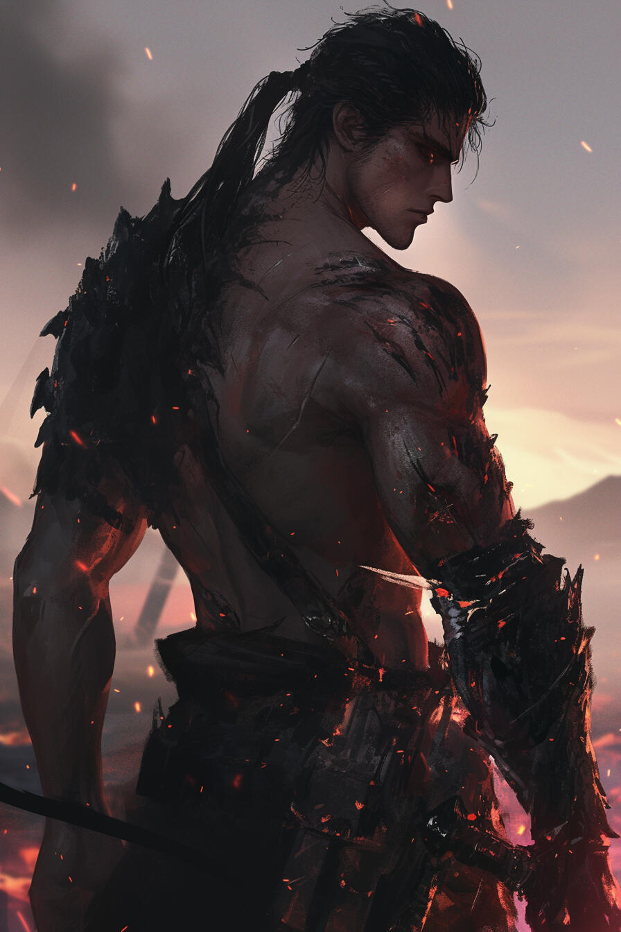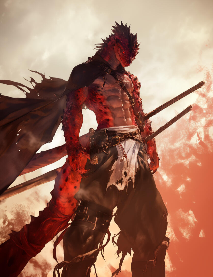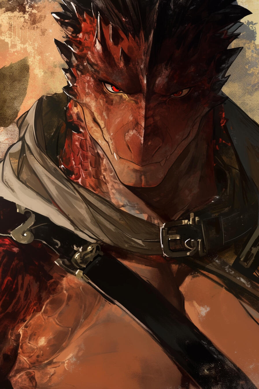 Standing at a towering seven feet and one inch, Sszarok is an imposing figure. His body is built for both agility and power, his movements smooth and predatory despite his size. His scales are a deep dark red, like molten rock cooled under shadow, with faint black undertones that shimmer when light touches them.A jagged black mohawk runs from the crown of his head down the ridge of his neck. His crimson eyes burn like coals beneath a storm. His snout is angular and strong.His most striking feature, however, is his massive lizard’s tail — thick, muscular, and long. His hands and feet end in curved black claws, worn smooth from years of battle and escape. Across his chest and arms, old scars crisscross his hide like forgotten runes of survival.Despite his monstrous form, there’s a fierce charisma about Sszarok — he looks every bit the hunter he is, but behind the crimson eyes lies something far older — the ghost of a boy who once wanted to be good.