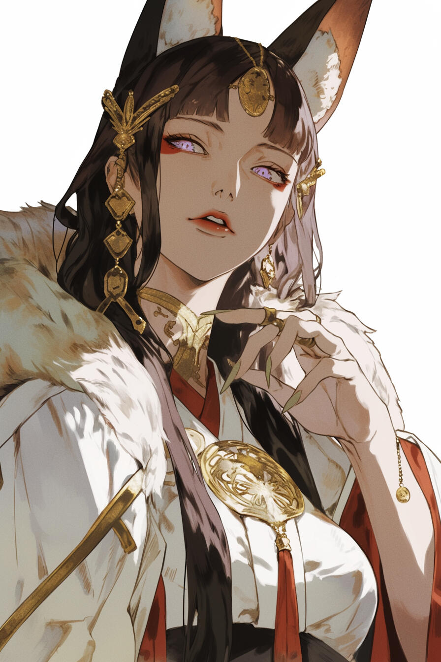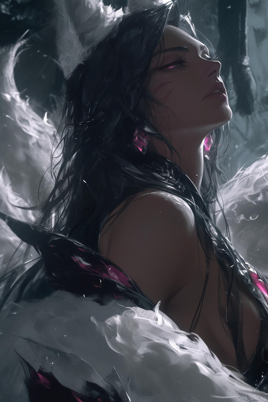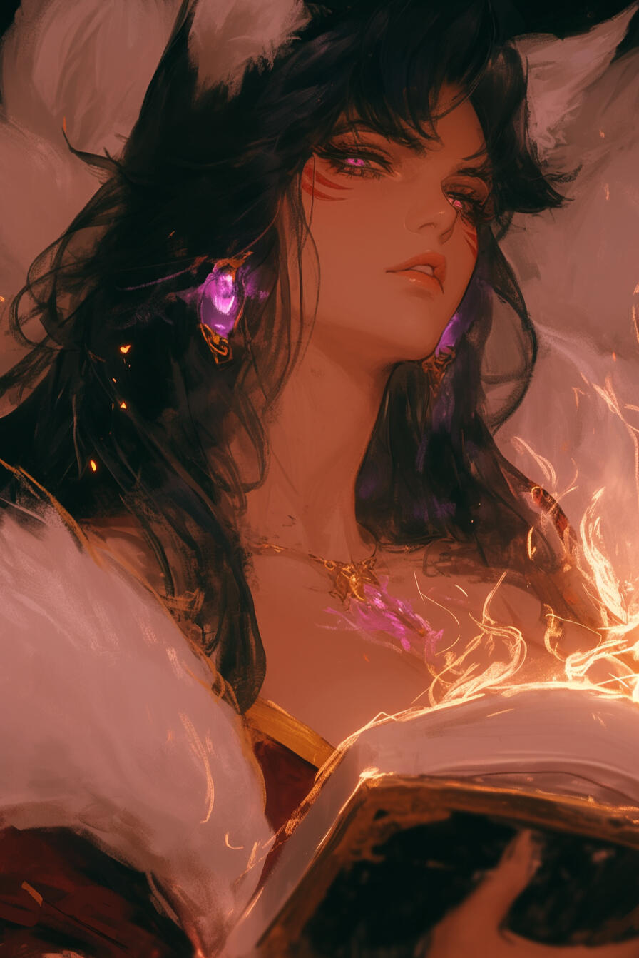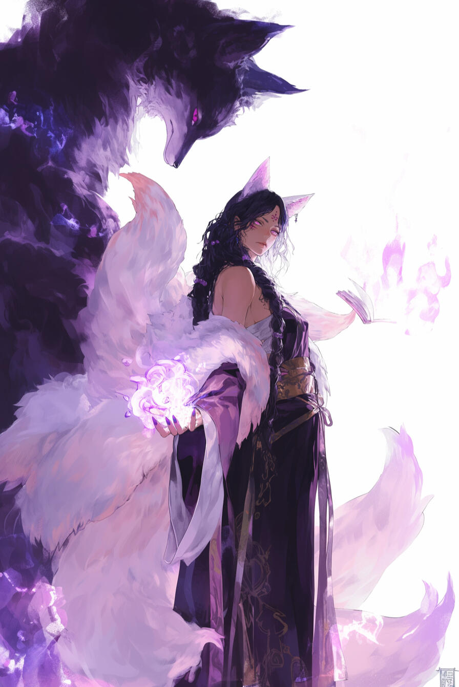 Silia stands at a striking height of five foot nine, her figure lithe yet strong, moving with the grace of a predator and the poise of a scholar. Her piercing violet eyes hold both mischief and intelligence. Six snowy white tails fan behind her, a testament to her mastery of the foxform and the ancient magics she wields.Her long, black hair, streaked with faint violet, flows like a shadowed river down her back, framing a face both cunning and captivating. Her tanned skin glows softly beneath the sun, giving her an almost ethereal allure, while her clawed fingers hint at the wildness that lies beneath her sophisticated exterior.Though her beauty is undeniable, it is a bewitching, dangerous sort — one that speaks of arcane power, deadly skill, and secrets not easily revealed. Every movement and glance carries the weight of both enchantment and cunning, marking her as a presence not soon forgotten, and a mage whose prowess rivals even the most storied archmages of Eltia.