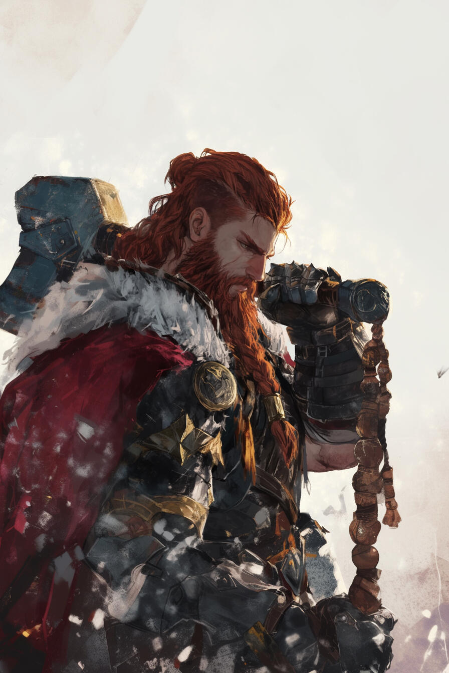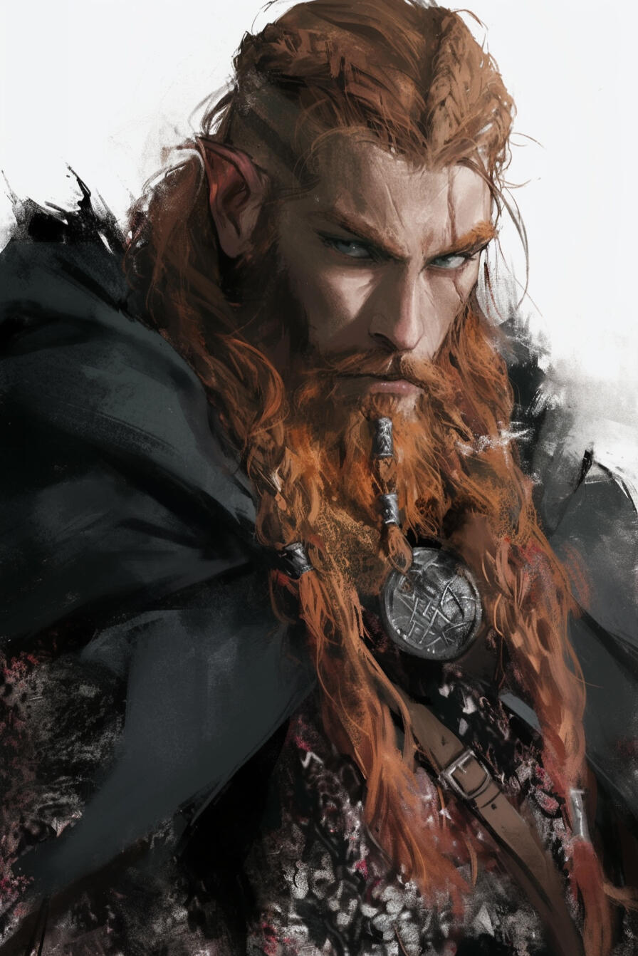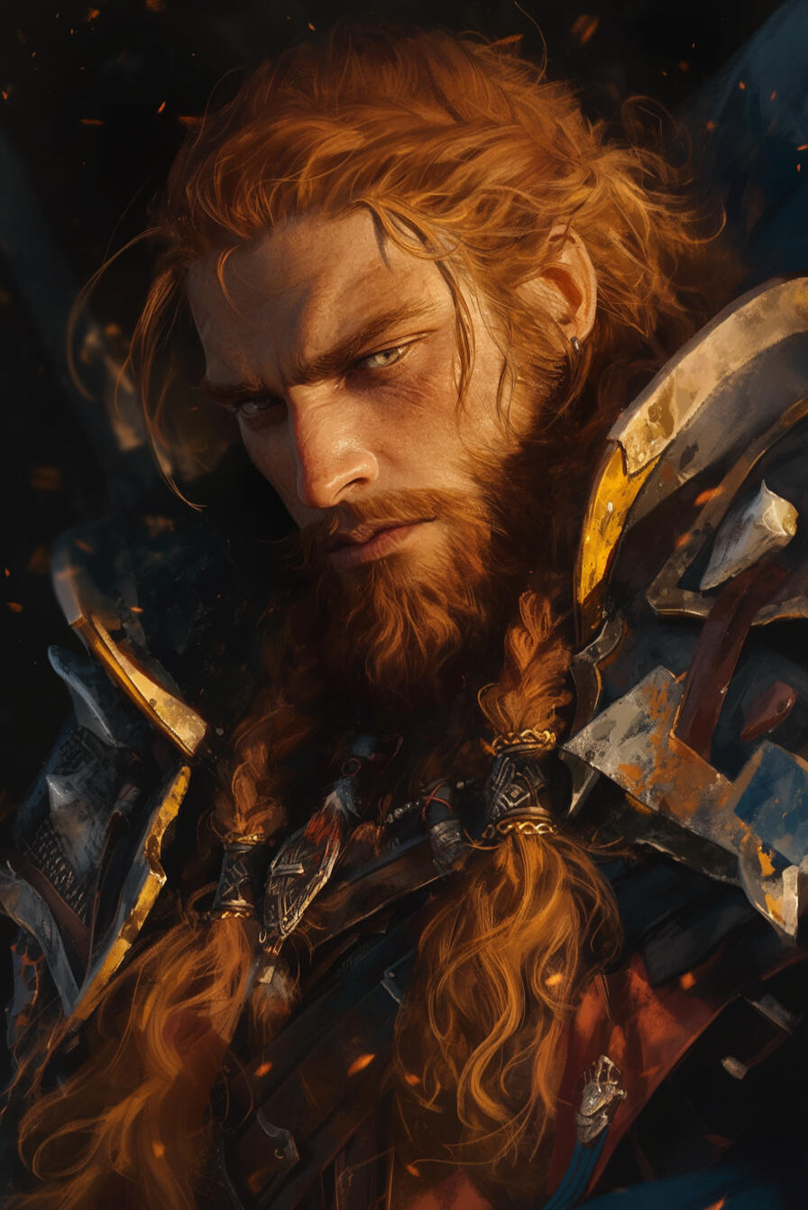 King Durrin Thusunder III, at 145 years old, rules the Dwarven Kingdom with thick red hair, steady gray eyes, and a powerful frame carved by leadership. Wise and authoritative, he commands loyalty with quiet certainty. Brother to Bramdor and son of Khram, he carries the shadow of his brother’s imprisonment and escape, knowing old secrets still echo beneath the mountains.