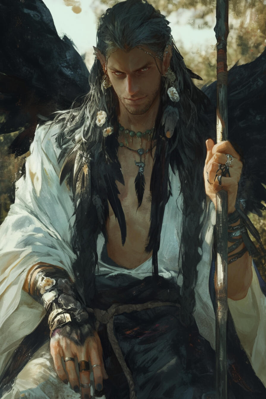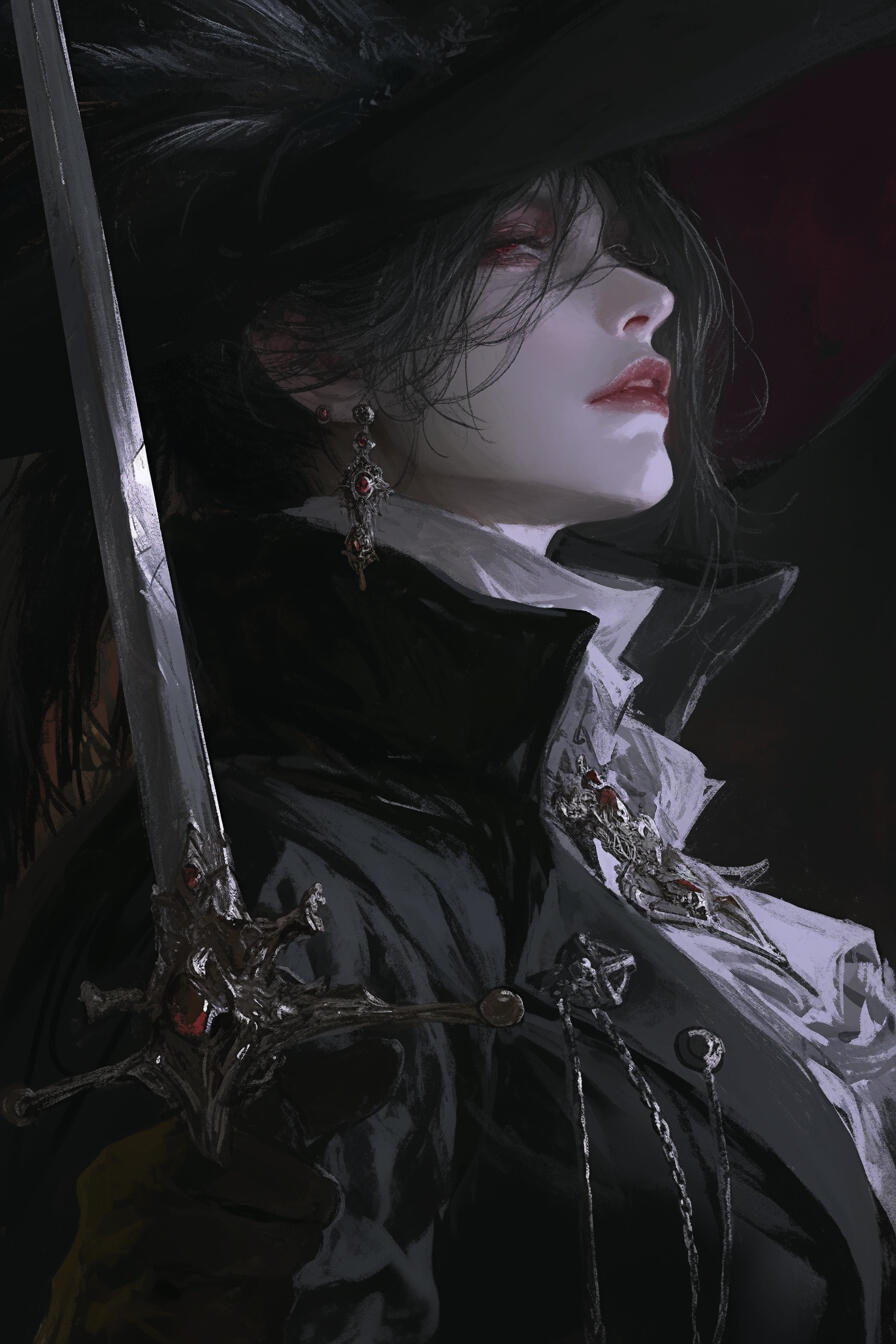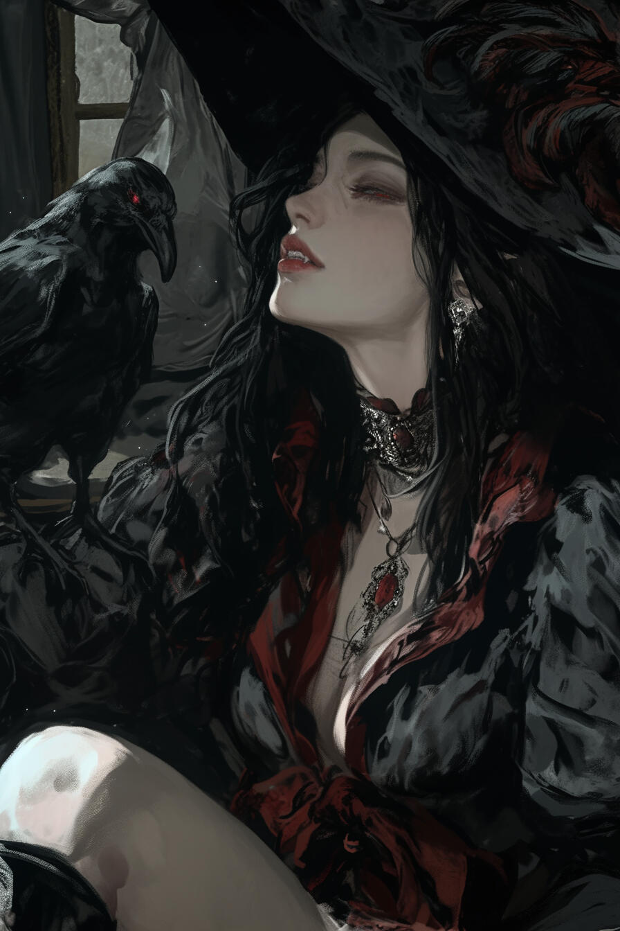 Selvara stands at roughly 6'2", her frame slender and graceful, moving with effortless poise.Her skin is porcelain-pale, untouched by sun, giving her an ethereal, almost statuesque quality.Her long black hair falls straight and smooth, often partially braided or tucked behind one ear and her red eyes are keen and calculating.She wears layered, travel-ready clothing in deep tones of charcoal, plum, and crimson, paired with soft leather boots, a hooded cloak, and a signature black feathered hat that tilts jauntily to one side, both stylish and practical for concealing her identity. Subtle silver jewelry —rings, thin chains, or a single ear cuff — hints at noble craftsmanship.