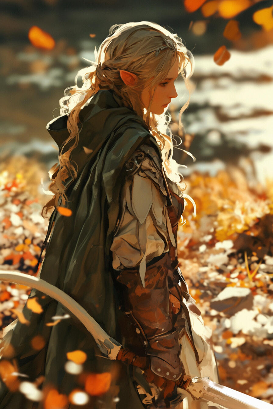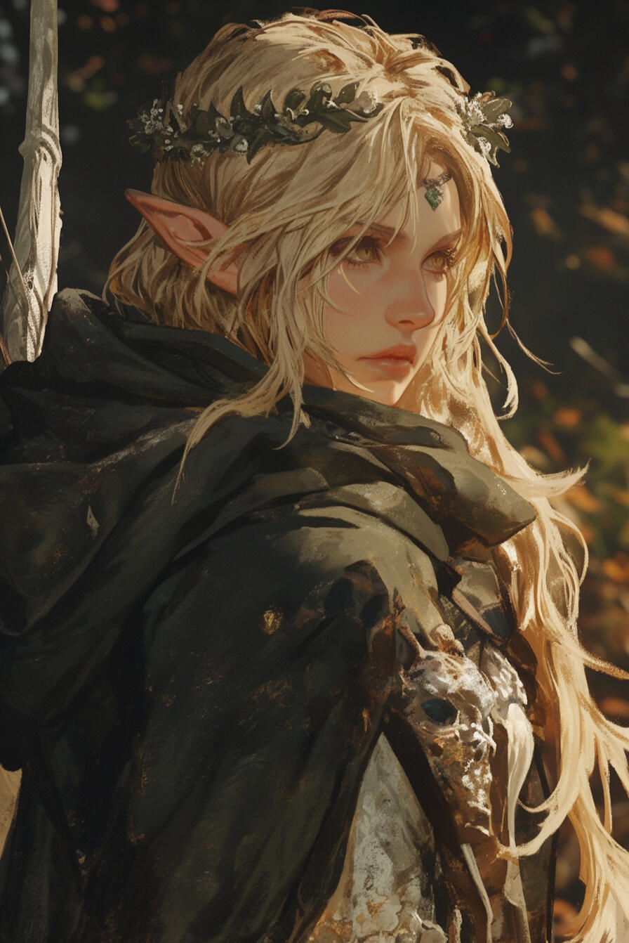 Aelithra stands at five feet and four inches, her movements marked by a grace that belies her slender frame. Her skin is pale as moonlight, smooth and radiant, yet subtly toned from years of training and travel.Golden locks tumble in gentle waves past her shoulders, often woven into a loose princess braid, framing a face of delicate features and solemn golden eyes that seem to hold both sorrow and wisdom. Her presence is calm and serene, but there is a quiet strength in the way she carries herself, a poised elegance born of both birth and experience.Though she bears no imposing stature, she moves with unmatched stealth and fluidity, her every step deliberate and measured. Many who see her would call her one of the most beautiful elves in all of Eltia — a beauty not merely of appearance, but of composure, skill, and the quiet power that radiates from within.