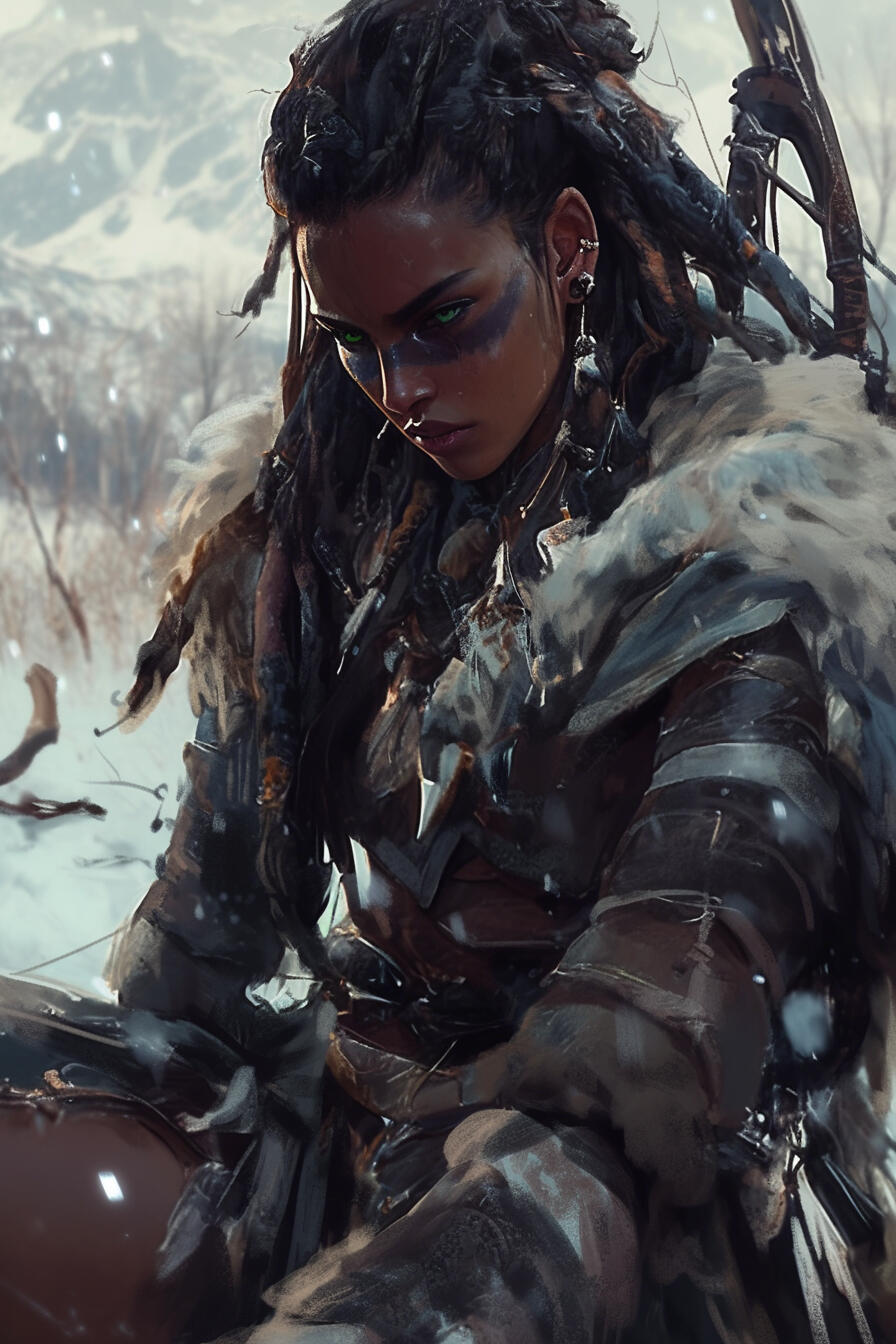 Skara stands at 5'10", her build athletic and powerfully conditioned rather than bulky, shaped by years of travel, hunting, and endurance in unforgiving climates.Her dark skin is weathered by cold winds and sun glare off snowfields, bearing faint scars along her arms and shoulders—old marks from training, hunts, and survival rather than ornamentation. Sharp green eyes sit beneath a constant trace of vigilance.Her hair is long, black, and tightly coiled, dense and springy in texture, often worn braided or pulled back to keep it from interfering during hunts. Purple war-paint is commonly brushed around her eyes in angular patterns, both practical against glare and symbolic of her bond to the Stendar Wolf Clan.