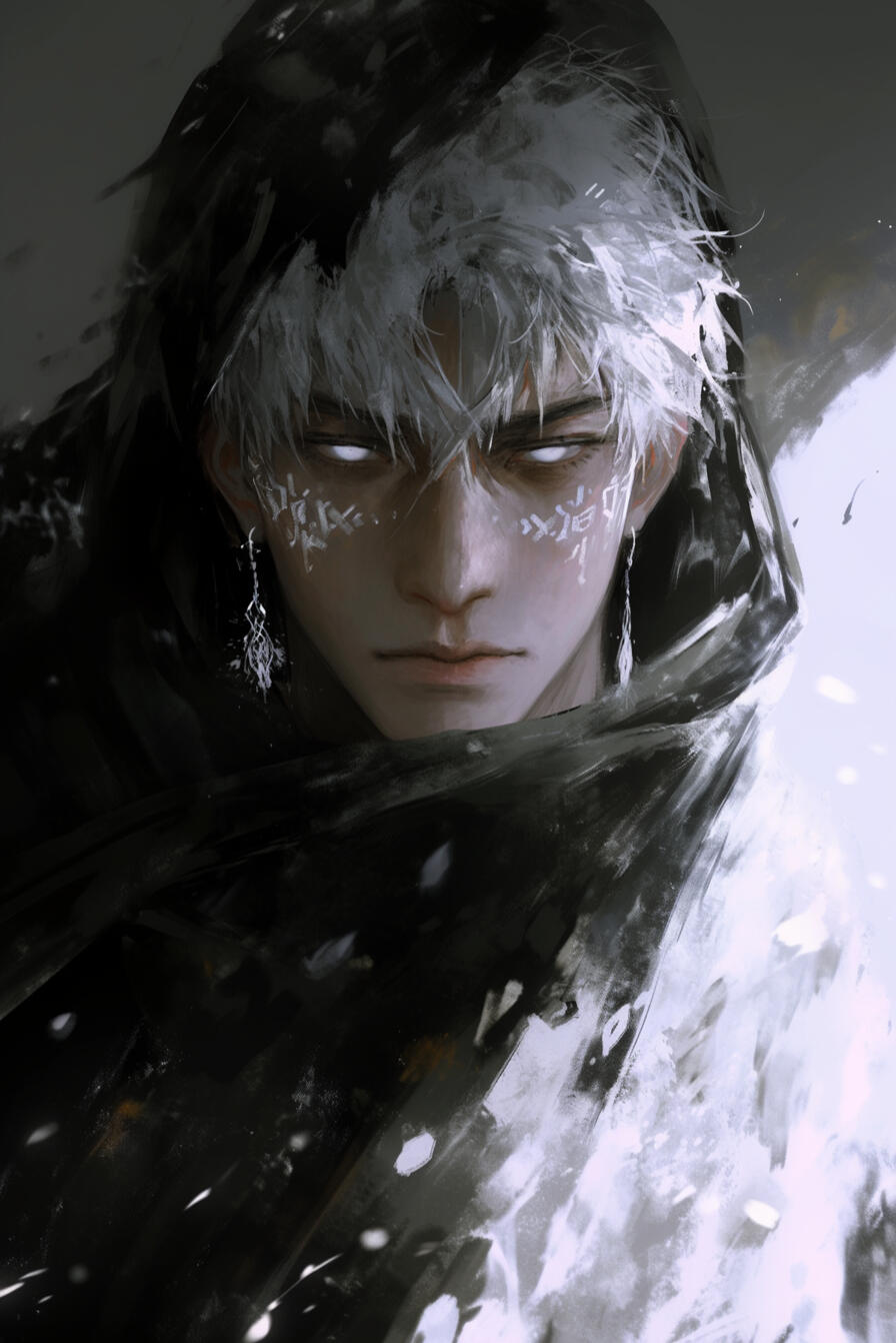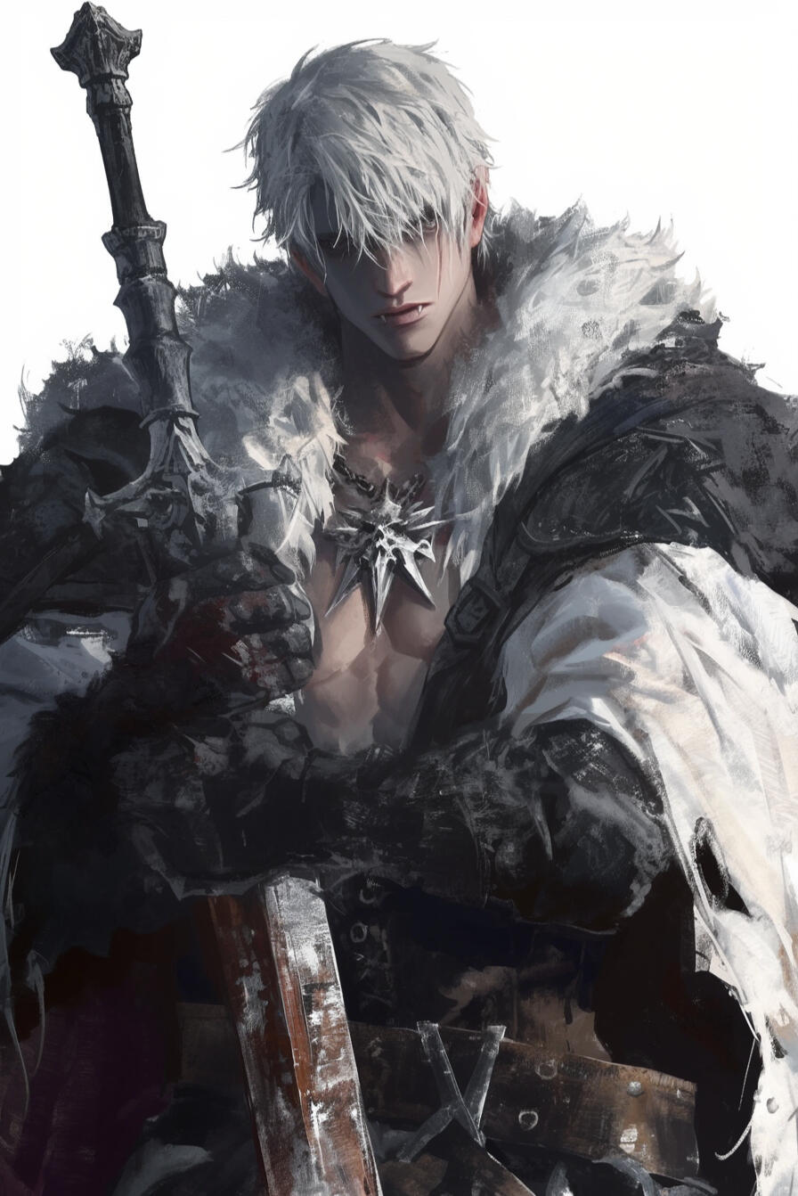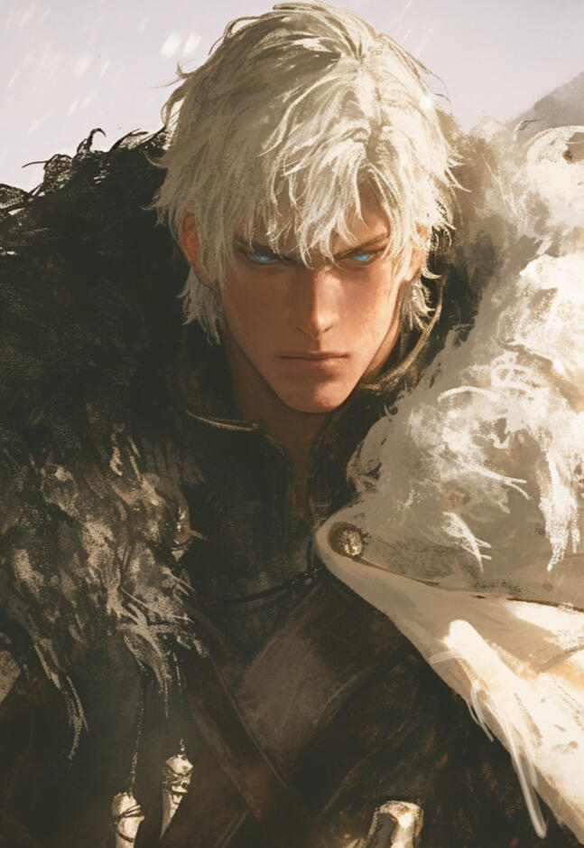 Kalrik of Fenvarr stands tall as a northern pine, near six and a half feet in height, broad of shoulder and built like the mountains that birthed him. The years of battle and wandering have carved their tale upon his flesh — a body of iron sinew and old scars, each mark a memory of blood and survival.His skin bears the pallor of frost, pale as moonlight upon winter stone, while his hair — a wild mane of snow-white locks — falls ragged across a brow shadowing eyes of cold and glacial blue. His forearms and hands betray the beast within — half-wolf in form, corded with sinew and veined with power, ending in dark, clawed fingers capable of rending through steel as easily as flesh. Fur creeps faintly along the edges of his arms.A strong jaw and thin, grim-set lips lend him the visage of a man both proud and weary, as though the North itself shaped him in its image. Many who cross his path would call him striking, even handsome in that hardened, dangerous way — a beauty tempered by storm and steel.