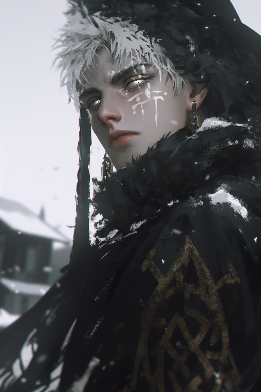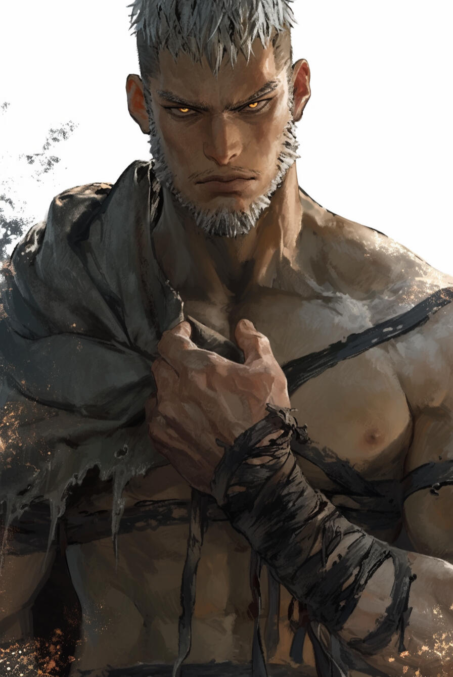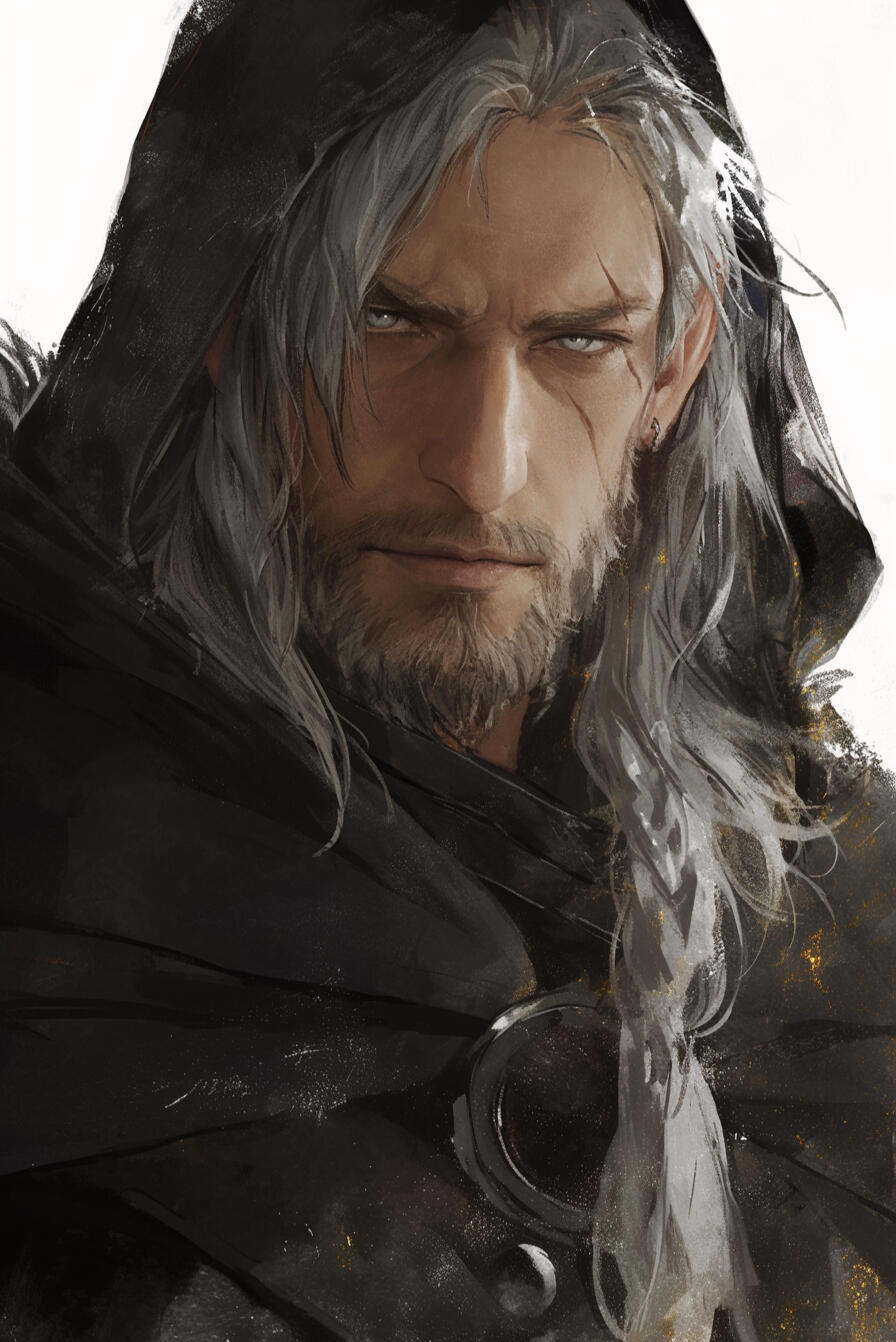 Kalrik of Fenvarr stands tall as a northern pine, near six and a half feet in height, broad of shoulder and built like the mountains that birthed him. The years of battle and wandering have carved their tale upon his flesh — a body of iron sinew and old scars, each mark a memory of blood and survival.His skin bears the pallor of frost, pale as moonlight upon winter stone, while his hair — a wild mane of snow-white locks — falls ragged across a brow shadowing eyes of cold and glacial blue. His forearms and hands betray the beast within — half-wolf in form, corded with sinew and veined with power, ending in dark, clawed fingers capable of rending through steel as easily as flesh. Fur creeps faintly along the edges of his arms.A strong jaw and thin, grim-set lips lend him the visage of a man both proud and weary, as though the North itself shaped him in its image. Many who cross his path would call him striking, even handsome in that hardened, dangerous way — a beauty tempered by storm and steel.