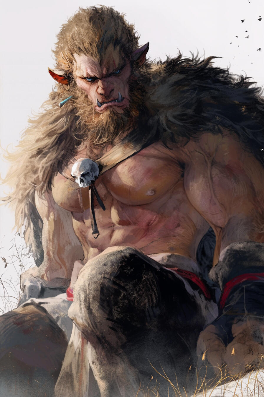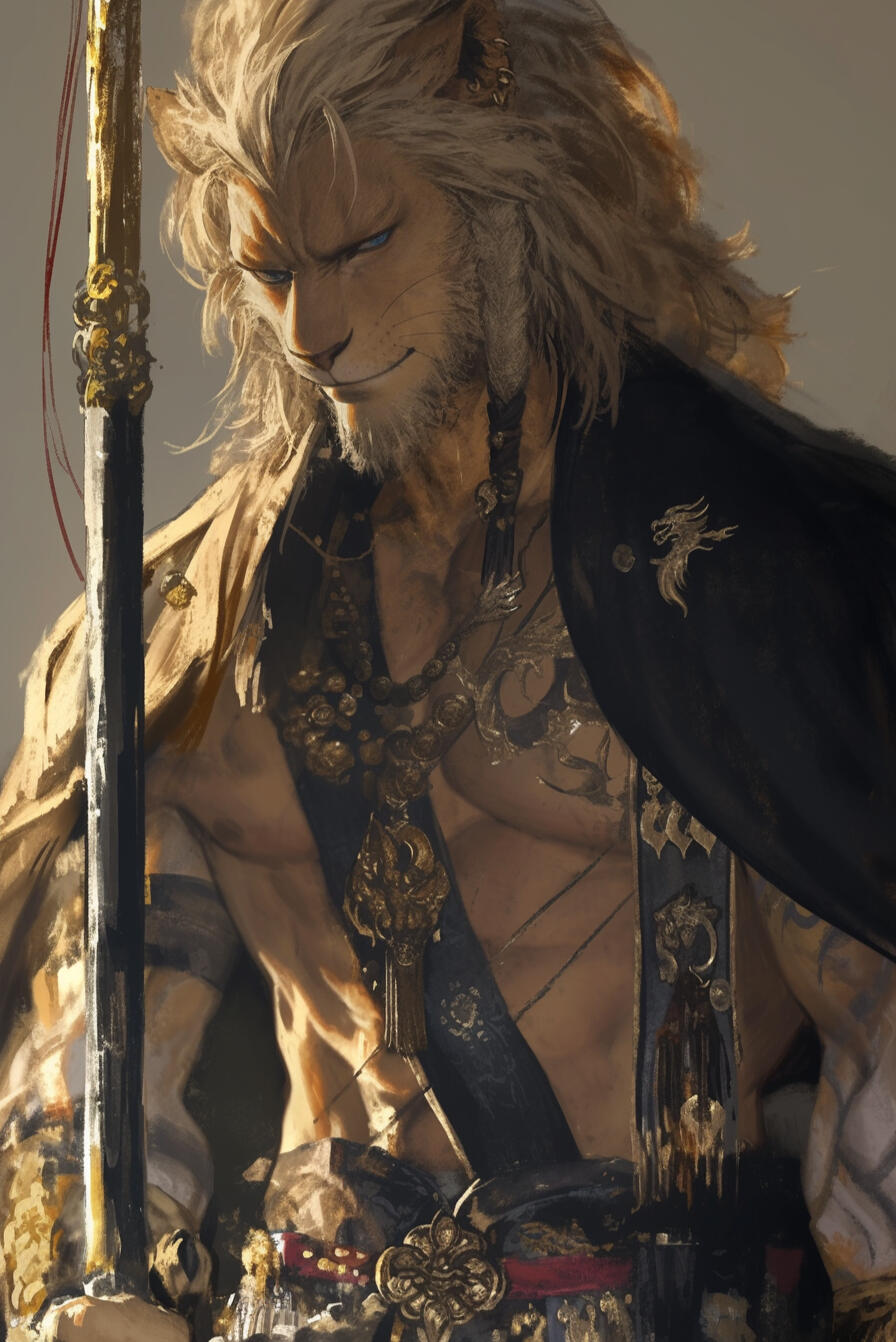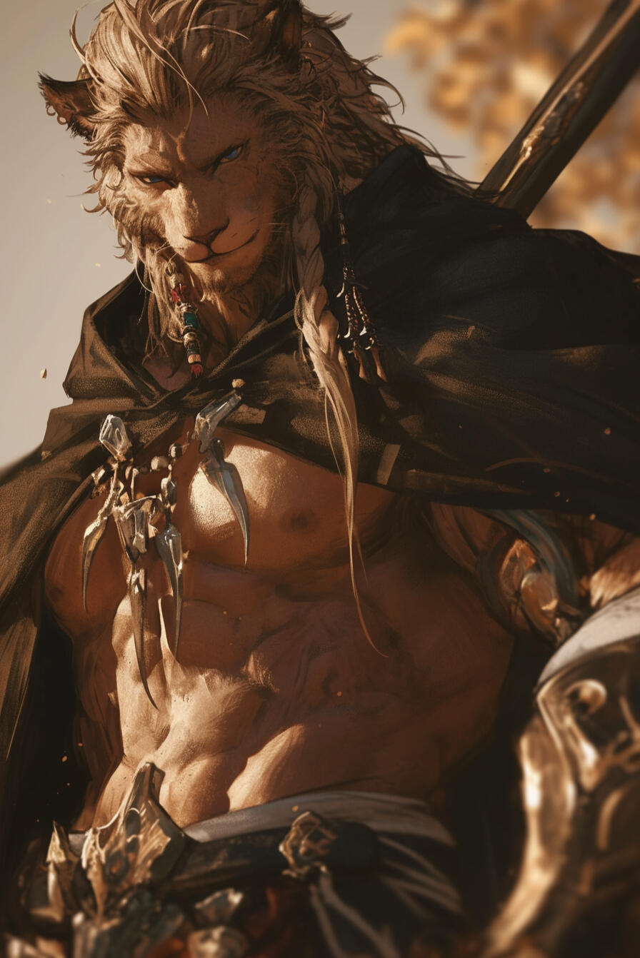 Zeh’ran towers above most, a mountain of muscle at seven feet three, honed through years of combat and the rigors of his lionkin heritage. Golden-tan fur covers much of his body, soft yet bristling with strength, while a long mane of sun-blonde hair, streaked with a few carefully kept braids. Proud lion ears peek through the mane, and a thick, powerful tail sways behind him. His hands and feet are lion-like paws, clawed and formidable.His shoulders are broad, his chest deep and corded with muscle, each limb a testament to relentless training and countless battles. Zeh’ran’s jaw is strong, his features angular yet noble with a lion's snout, his blue eyes sharp and piercing, always alert to threats or opportunities. Scars run along his forearms, shoulders, and torso, pale marks of fights survived and victories hard-won.His presence radiates authority, pride, and ferocity. While imposing and fearsome in appearance, there is also a natural majesty to him, a regal bearing befitting a Lionkin prince of House Vazthar.