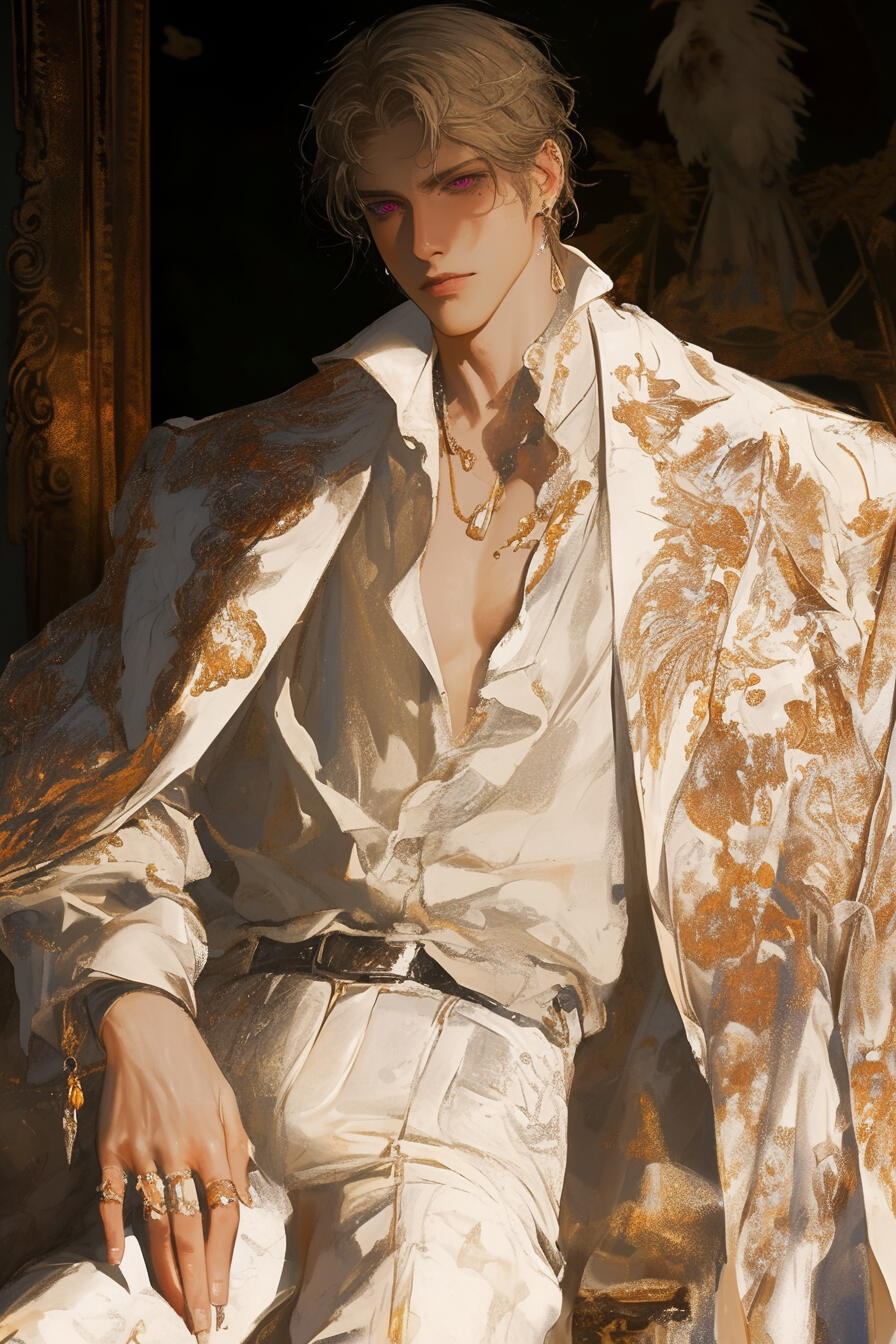Aethor stands at 6'4", tall and striking, his build lean and elegant rather than overtly muscular, carrying the effortless poise of elven blood tempered by something sharper beneath the surface.His pale white-gold hair is kept slicked back with deliberate precision, though it never fully hides the faintly unruly nature of it, as if it resists complete control. His soft violet eyes are cool and observant.His features are refined to an almost unsettling degree—high cheekbones, a smooth jawline, and a sculpted mouth that makes his expressions feel intentional, even when he smiles. There is a distinct elven beauty to him, but it is twisted by a predatory edge, a look that suggests calculation rather than serenity.