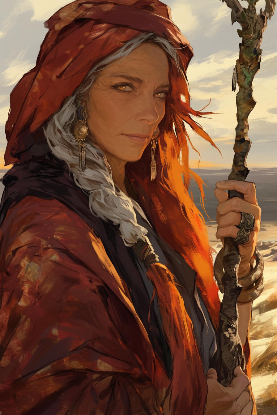 Kerna is a 140-year-old witch residing within Gullow Prison, her white hair tangled around piercing green eyes that see far more than she reveals. Subtle, manipulative, and deeply secretive, she wields knowledge as her sharpest spell, bending events without ever appearing to touch them.