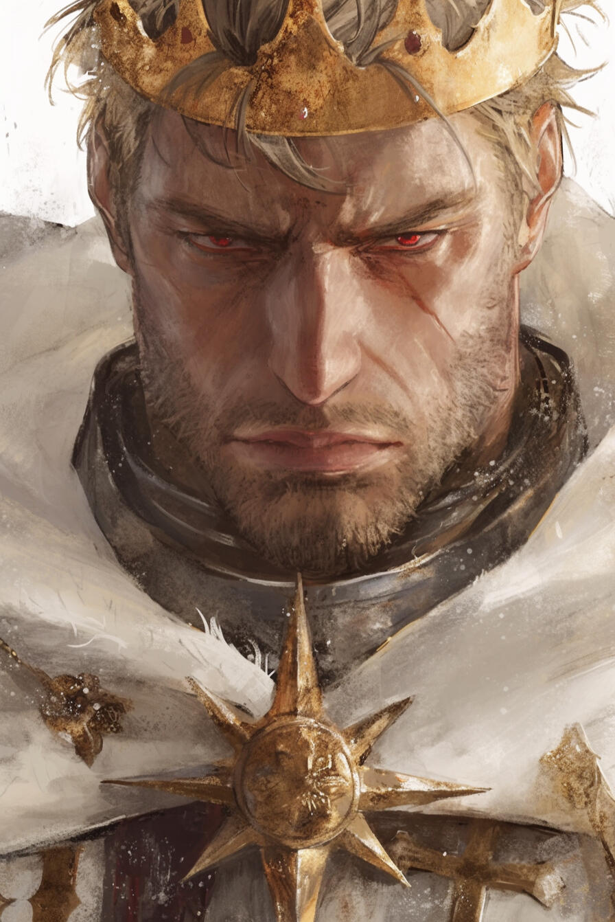 King Valenor Helior IV is a 52-year-old human ruler whose short blonde hair, piercing blue eyes, and commanding presence define his image as Solgard’s powerful monarch. Handsome, proud, and fiercely ambitious, he governs with an iron sense of justice sharpened by strategic foresight. Though he never married, his lineage is secure through several children, including Crown Prince Avandri.