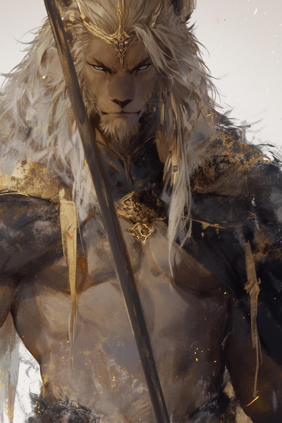 King Raegar Vazthar is a 49-year-old lionkin king of Kuram, towering with a golden mane, blue eyes, and a warrior’s build. Stern and vigilant, he embodies the harsh resolve of the desert nation, ruling with unwavering discipline while bearing the weight of constant threats against his people.