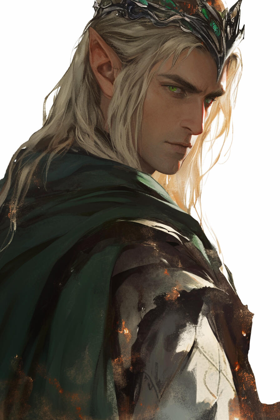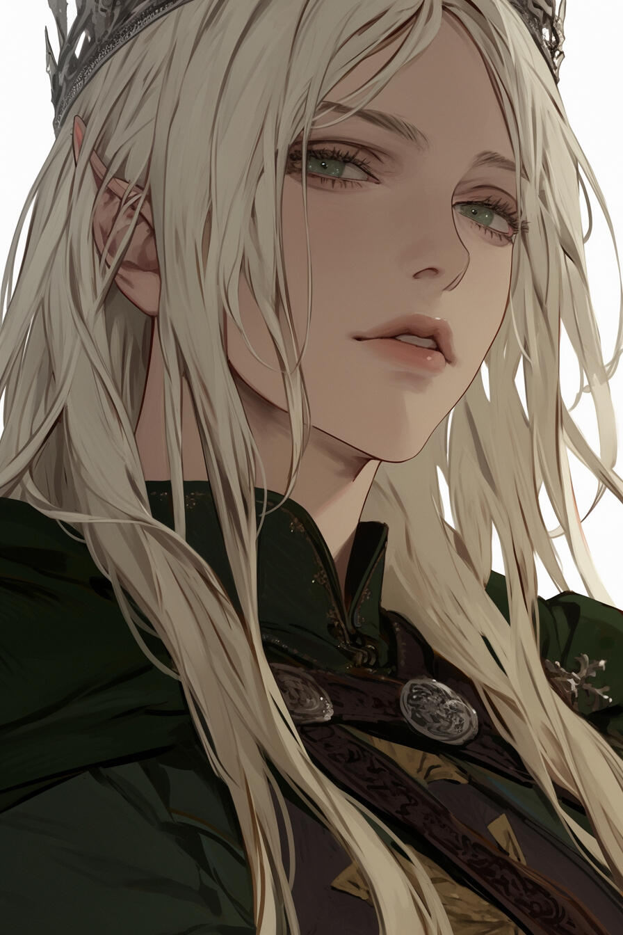 King Elisar Vanyrion, 967 years old, rules Elmar with timeless grace — long blonde hair, deep green eyes, and a diplomat’s calm. Patient and thoughtful, he carries centuries of wisdom, striving always to hold his realm steady against tides both mortal and divine.