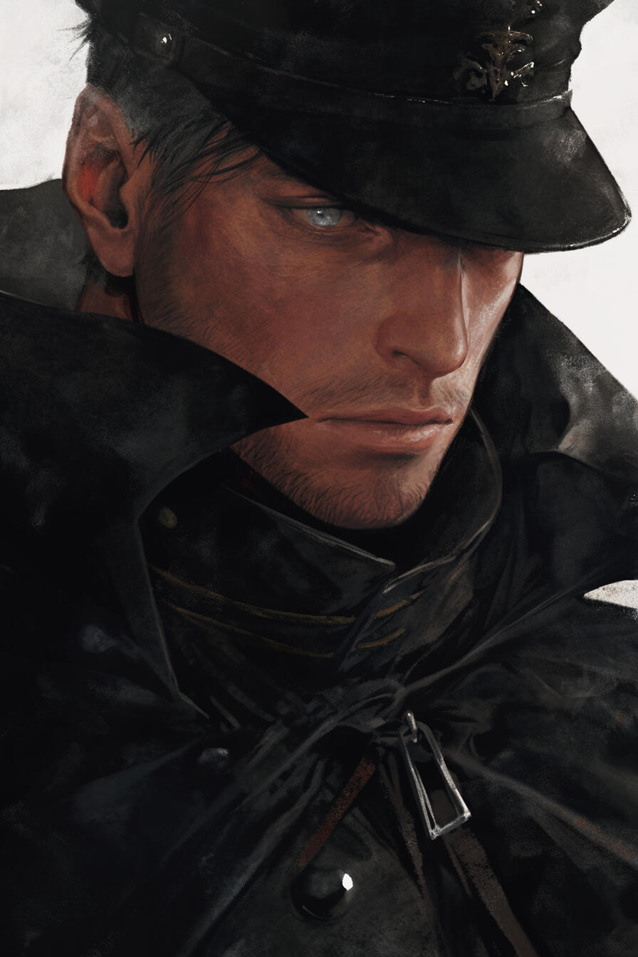 Ruvel stands tall and imposing, a tower of lean muscle at six feet four, his frame honed by years of training and tempered by the latent draconic power coursing through his veins. Scars lace his forearms and shoulders but also on the left side of his face, thin white lines etched from battles both mundane and arcane.His skin is fair, almost luminous under sunlight, a contrast to the darkness of his short black hair, which falls in short practical waves, partially shadowing his piercing golden eyes. Those eyes, bright and unflinching, seem to glow with an inner fire, a reminder of his draconic lineage. A strong, angular jaw and thin lips frame a face both striking and enigmatic, the kind of visage that draws attention even when he offers no smile.Though his stature is commanding, there is a subtle grace to him, a coiled readiness in his stance that speaks of lethal efficiency.