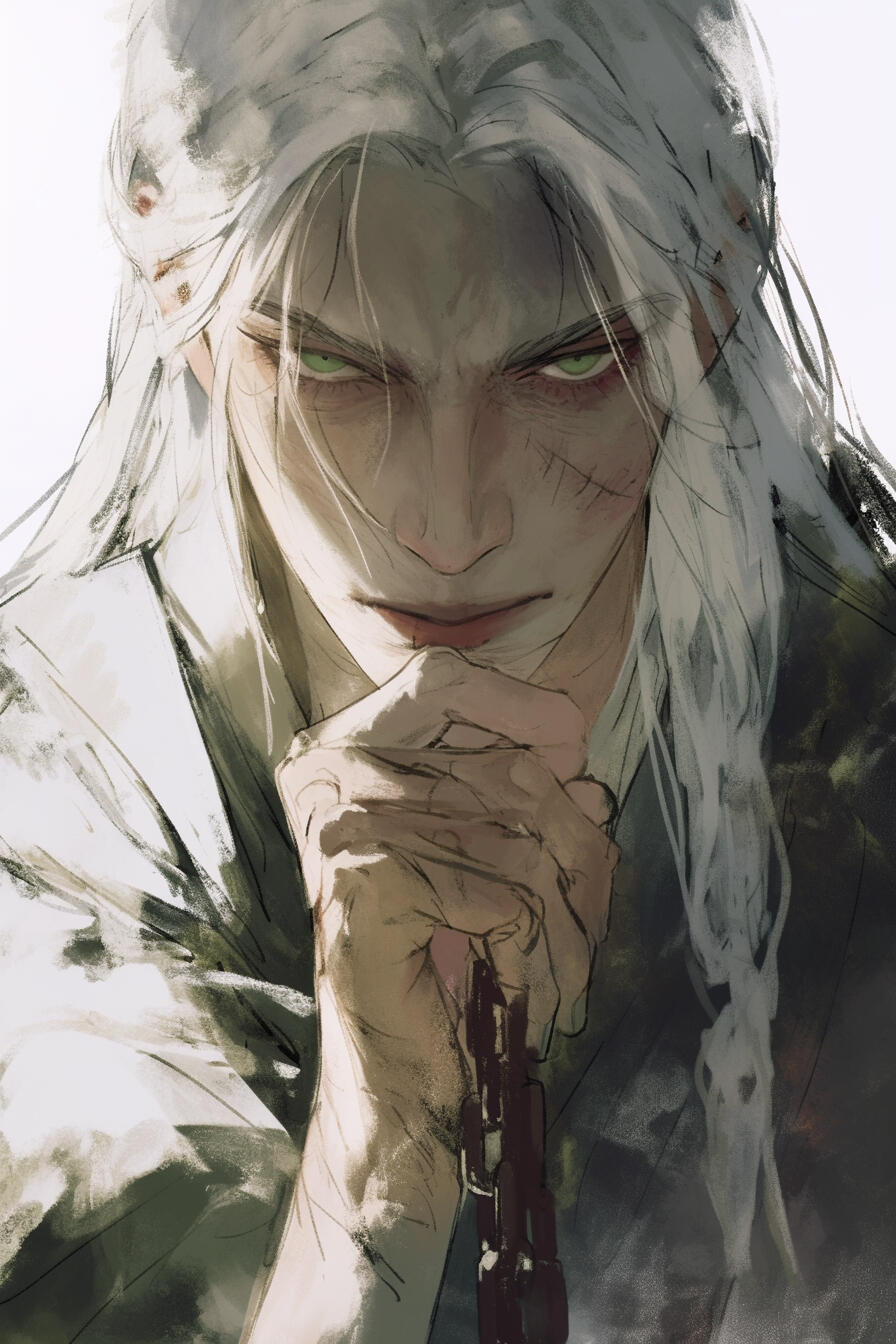 Jharvek stands at 6'3", his frame tall and lean, more wiry than muscular. His greenish skin carries the faint markings of his orc heritage.Short silver hair is partially slicked back, though a few bangs fall over his forehead, giving him a slightly disheveled, thoughtful look.His red eyes are sharp and observant, though they often betray a hint of unease or insecurity when facing unfamiliar crowds. His facial features are a mix of human refinement and orcish strength — high cheekbones, a straight nose, and a jawline that hints at inherited power without being imposing with tusks protruding from his mouth.Jharvek favors practical, modest clothing suited for travel and study: a white tunic under a long, weathered coat with multiple pockets for scrolls and tools, sturdy trousers, and worn boots. A small satchel hangs across his shoulder, containing notebooks, quills, and alchemical trinkets.