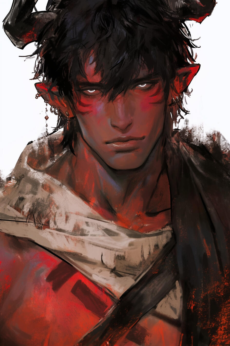 Drake, a 27-year-old tiefling prisoner, bears red skin, small horns, anxious white eyes, and the haunted demeanor of someone constantly bracing for danger. Bound in fearful service to House Tiatemrend, he struggles to find any sense of identity beyond obedience and survival.