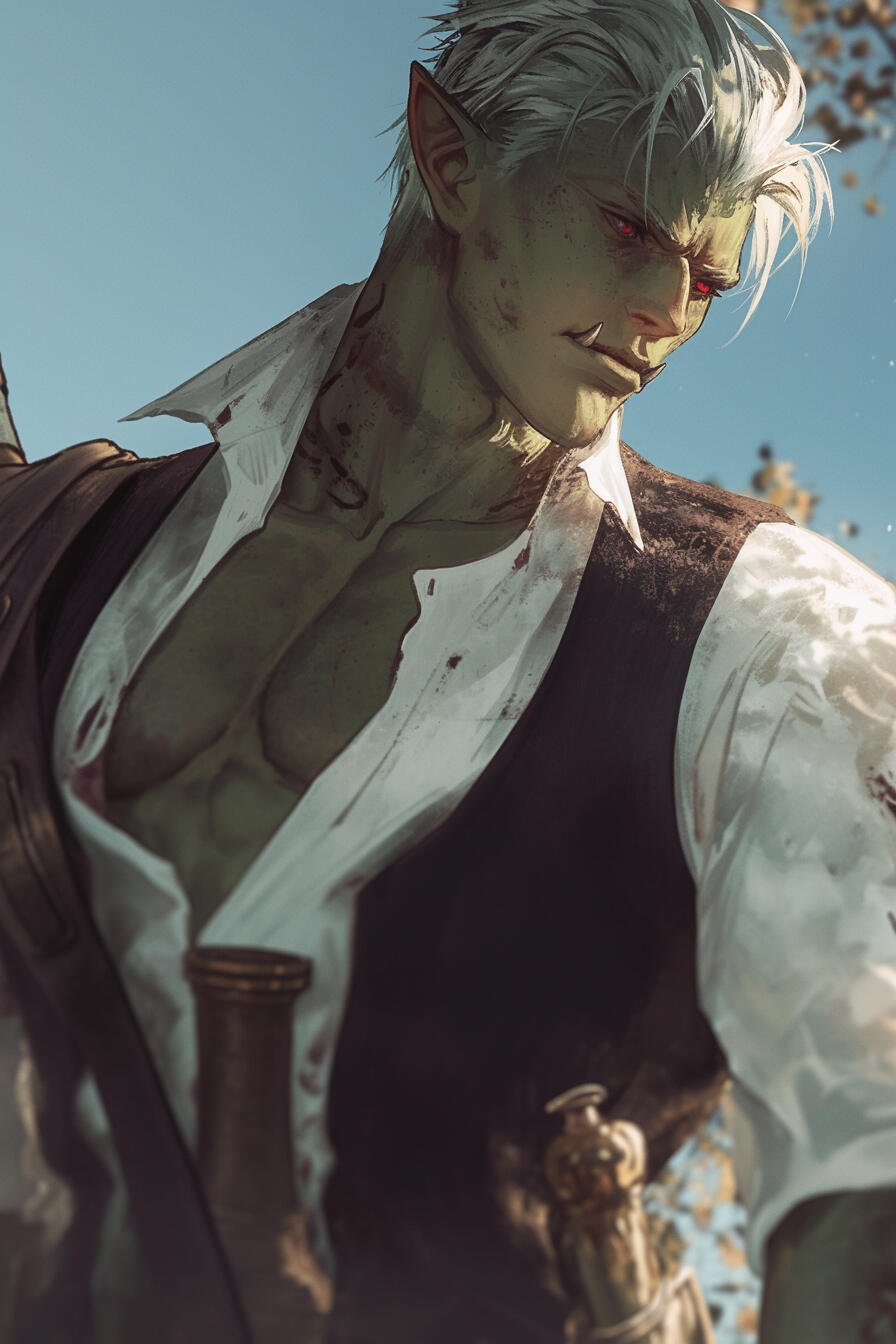 Jharvek stands at 6'3", his frame tall and lean, more wiry than muscular. His greenish skin carries the faint markings of his orc heritage.Short silver hair is partially slicked back, though a few bangs fall over his forehead, giving him a slightly disheveled, thoughtful look.His red eyes are sharp and observant, though they often betray a hint of unease or insecurity when facing unfamiliar crowds. His facial features are a mix of human refinement and orcish strength — high cheekbones, a straight nose, and a jawline that hints at inherited power without being imposing with tusks protruding from his mouth.Jharvek favors practical, modest clothing suited for travel and study: a white tunic under a long, weathered coat with multiple pockets for scrolls and tools, sturdy trousers, and worn boots. A small satchel hangs across his shoulder, containing notebooks, quills, and alchemical trinkets.