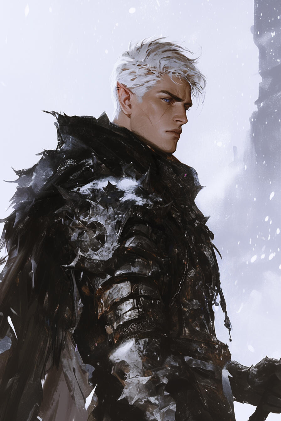 Kalrik of Fenvarr stands tall as a northern pine, near six and a half feet in height, broad of shoulder and built like the mountains that birthed him. The years of battle and wandering have carved their tale upon his flesh — a body of iron sinew and old scars, each mark a memory of blood and survival.His skin bears the pallor of frost, pale as moonlight upon winter stone, while his hair — a wild mane of snow-white locks — falls ragged across a brow shadowing eyes of cold and glacial blue. His forearms and hands betray the beast within — half-wolf in form, corded with sinew and veined with power, ending in dark, clawed fingers capable of rending through steel as easily as flesh. Fur creeps faintly along the edges of his arms.A strong jaw and thin, grim-set lips lend him the visage of a man both proud and weary, as though the North itself shaped him in its image. Many who cross his path would call him striking, even handsome in that hardened, dangerous way — a beauty tempered by storm and steel.