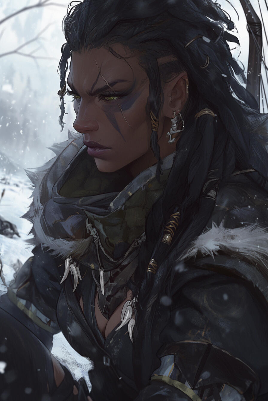 Skara stands at 5'10", her build athletic and powerfully conditioned rather than bulky, shaped by years of travel, hunting, and endurance in unforgiving climates.Her dark skin is weathered by cold winds and sun glare off snowfields, bearing faint scars along her arms and shoulders—old marks from training, hunts, and survival rather than ornamentation. Sharp green eyes sit beneath a constant trace of vigilance.Her hair is long, black, and tightly coiled, dense and springy in texture, often worn braided or pulled back to keep it from interfering during hunts. Purple war-paint is commonly brushed around her eyes in angular patterns, both practical against glare and symbolic of her bond to the Stendar Wolf Clan.